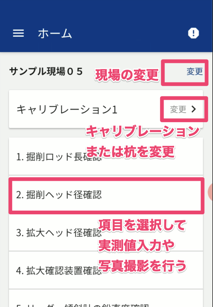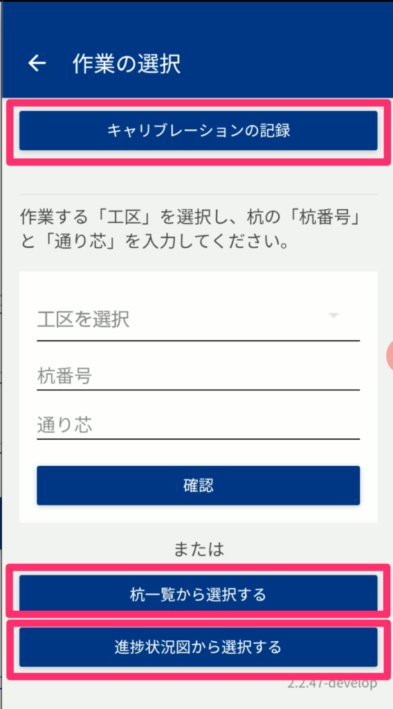 この画面では、現場や杭の切り替え、杭の事前入力情報の参照を行うことができます。