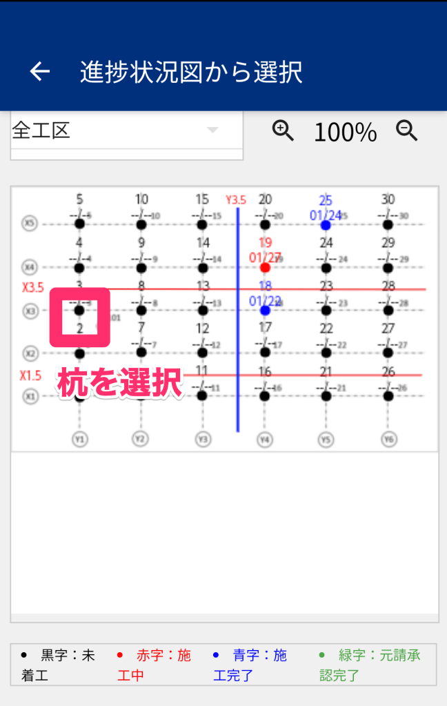 事前に登録した進捗状況図から、杭番号をタップすることで杭を選択することができます。
