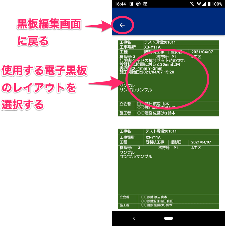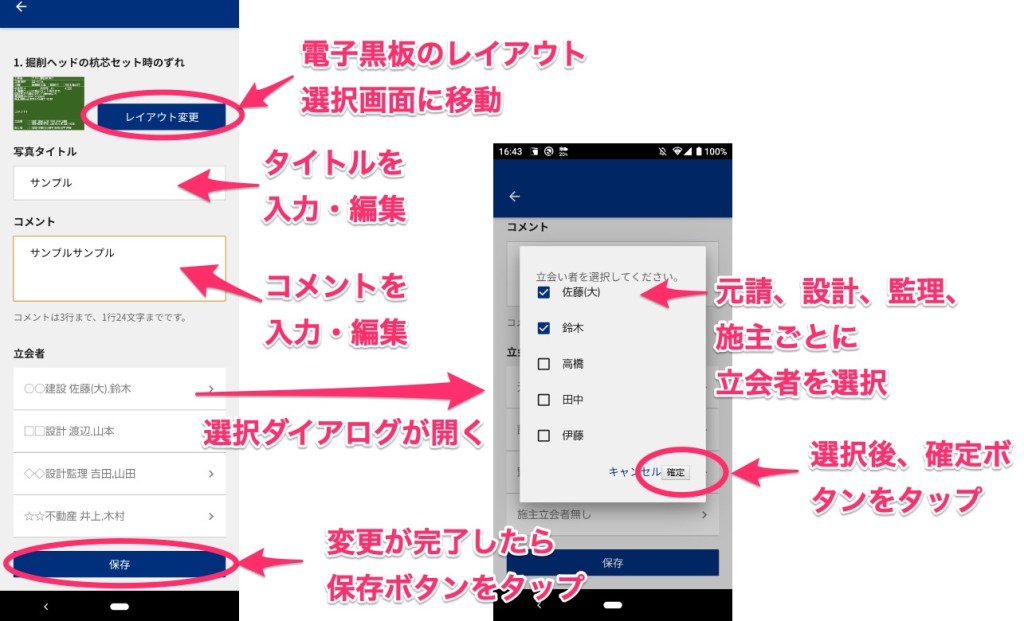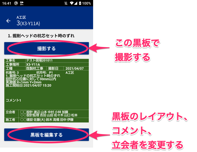 黒板編集画面では次のことができます。タイトル、コメント、立会者は事前に設定しておくことが可能ですので、キャリブレーションや試験杭など特記事項が多い場合は、事前入力しておくと便利です。