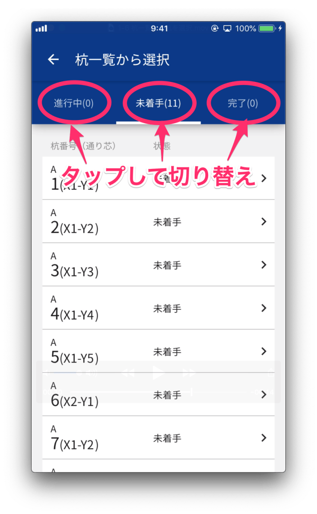 杭施工の状態が「着手中」「未着手」「完了」ごとに杭が分類されています。一覧の中から利用する杭を選択します