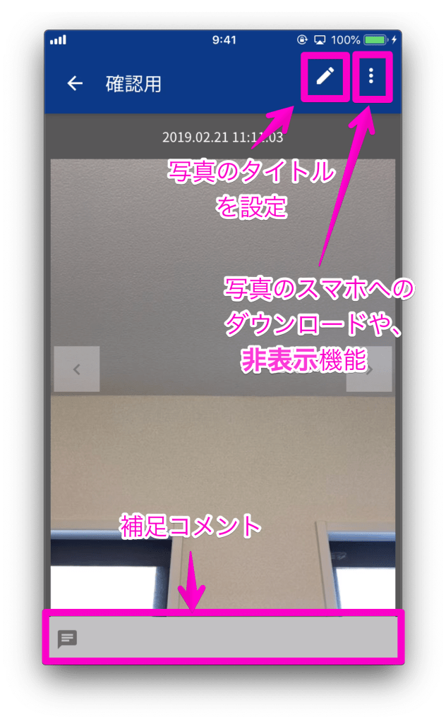 - 写真のタイトル、コメントの入力、修正が可能。設定した場合は、品質管理シートの写真台帳に出力される