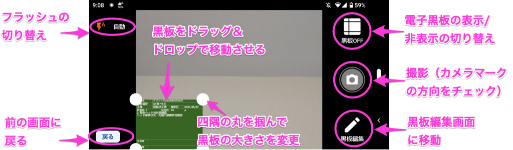 同じ黒板で撮影を行う場合は、連続して撮影を行うことができます。撮影が完了したら、「戻る」ボタンで元の画面に戻ってください。
